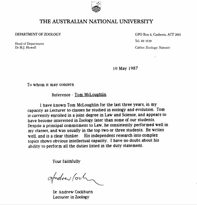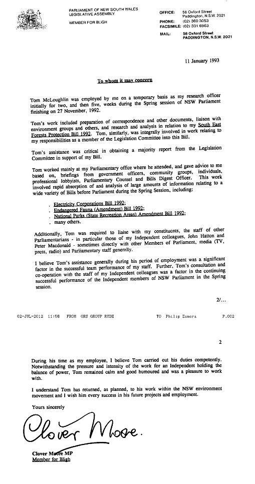 “Tom … was employed by on a temporary basis for 5 five weeks … 1992….. I believe Tom’s assistance generally during his period of employment was a significant factor in the successful team performance of my staff. Further, Tom’s consultation and co-operation with the staff of my Independent colleagues was a factor in the continuing successful performance of the Independent members of NSW Parliament in the Spring Session. … Notwithstanding the pressure and intensity of the work for an Independent holding the balance of power, Tom remained calm and good humoured and was a pleasure to work with … Tom has returned as planned to his work within the NSW environment movement and I wish him every success …”