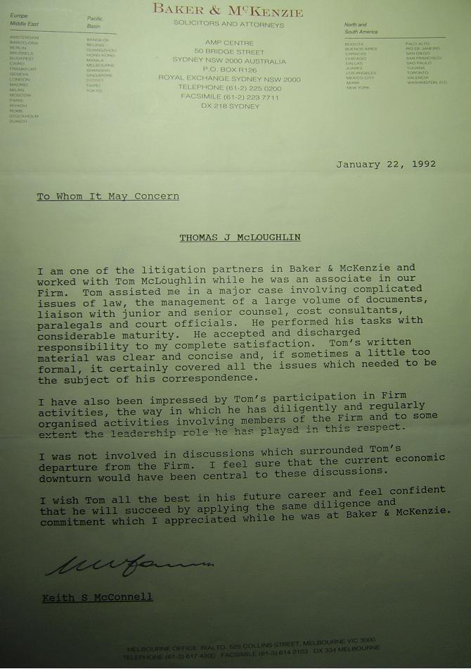 Keith S McConnell, partner Baker & McKenzie Solicitors and Attorneys, Sydney office, 22nd January 1992.
