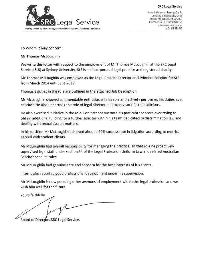 “Tom …worked as a volunteer at the Centre on a weekly basis … I am happy to recommend Tom for employment in a legal capacity …”